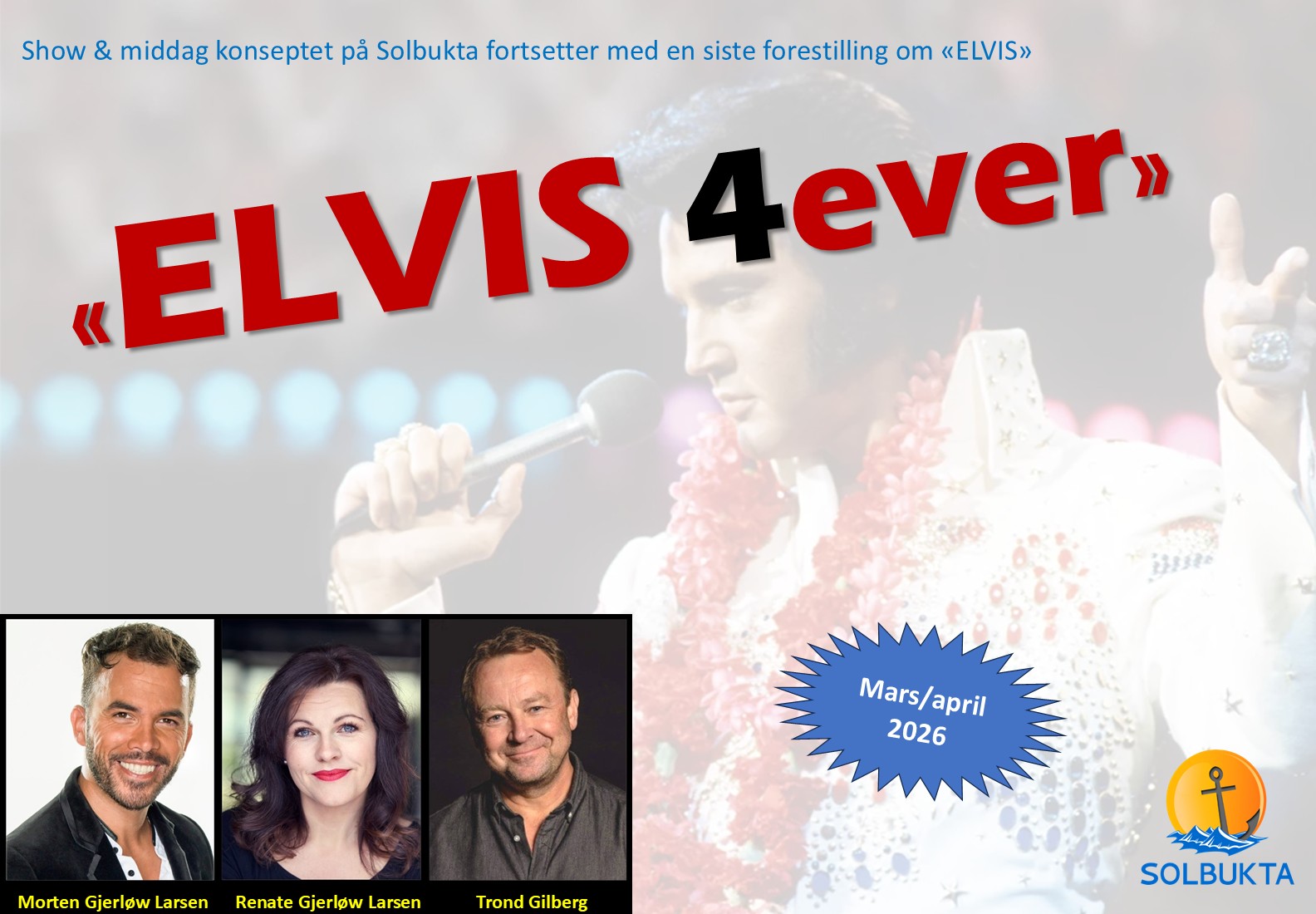 «Elvis 4ever» blir den siste i en rekke forestillinger om Elvis Presley og med hans største hits. Datoer: torsdag 19. mars og torsdag 26. mars OG: ekstraforestilling Onsdag 15. april! (Middag kl 18.00, etterfulgt av konsert. Kvelden er ferdig 21.00).